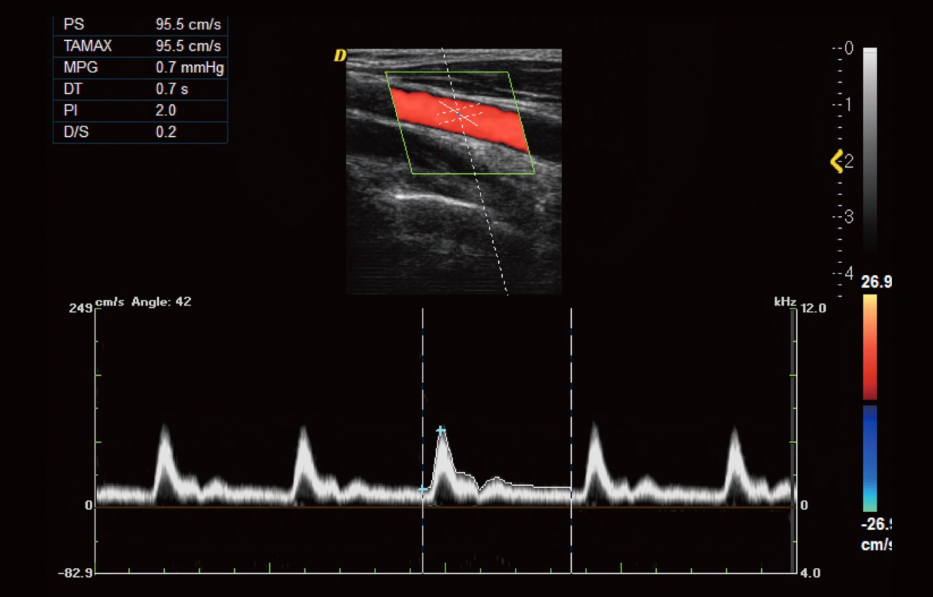 자동적이고 정확한 포락선 스펙트럼은 압력, 심박수, 저항 지수 등과 같은 혈역학적 지표를 자동으로 제공하여 정확한 평가를 용이하게 합니다.